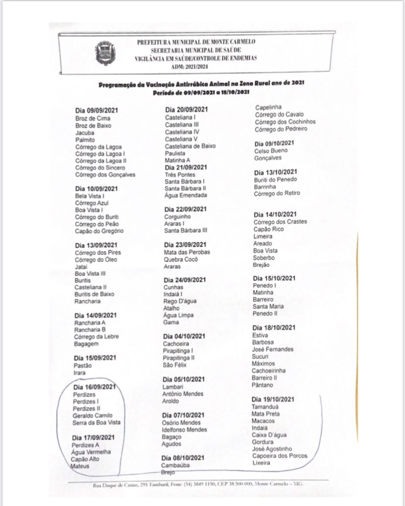 A prefeitura municipal de Monte Carmelo através da Secretária Municipal de Saúde, Vigilância em Saúde e Controle de Endemias divulgou a programação da vacinação Anti-rábica Animal que neste primeiro momento esta acontecendo na Zona Rural. Nessa segunda-feira (20) as equipes estarão nas fazendas Casteliana I, III, IV, V, Cateliana de Baixo, Paulista e Matinha A.