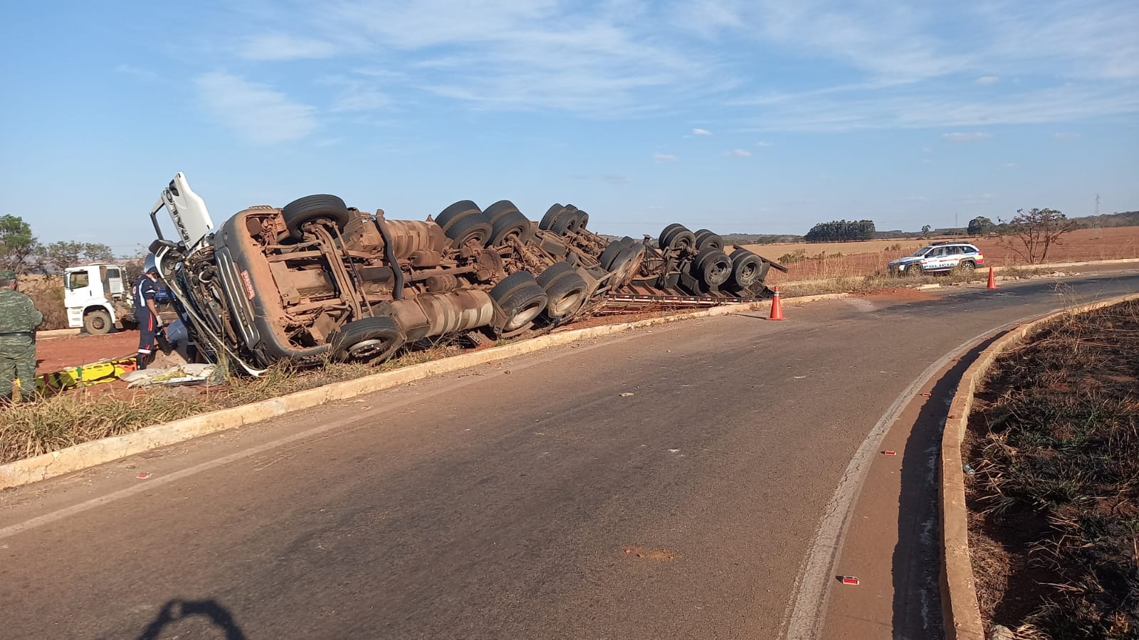 Acionados pela sala de operações a Policia compareceu no local do sinistro, onde havia uma combinação veicular de carga capotada, que fazia o transporte de 39 toneladas de fertilizantes que se espalharam fora da pista de rolamento. O condutor de 56 anos que vinha de Maringá/PR foi socorrido pelo SAMU com diversas escoriações e cortes pelo corpo permanecendo hospitalizado. A carga, bem com, o caminhão estavam em situação regular. Um dos tanques de combustível (diesel) estava vazando e com a ajuda de um produtor rural foi realizada a contenção. A pista foi liberada em ambos os sentidos e não houve prejuízo ao tráfego. O condutor alega que não conhecia o trajeto e ao iniciar o trevo perdeu o controle direcional.
