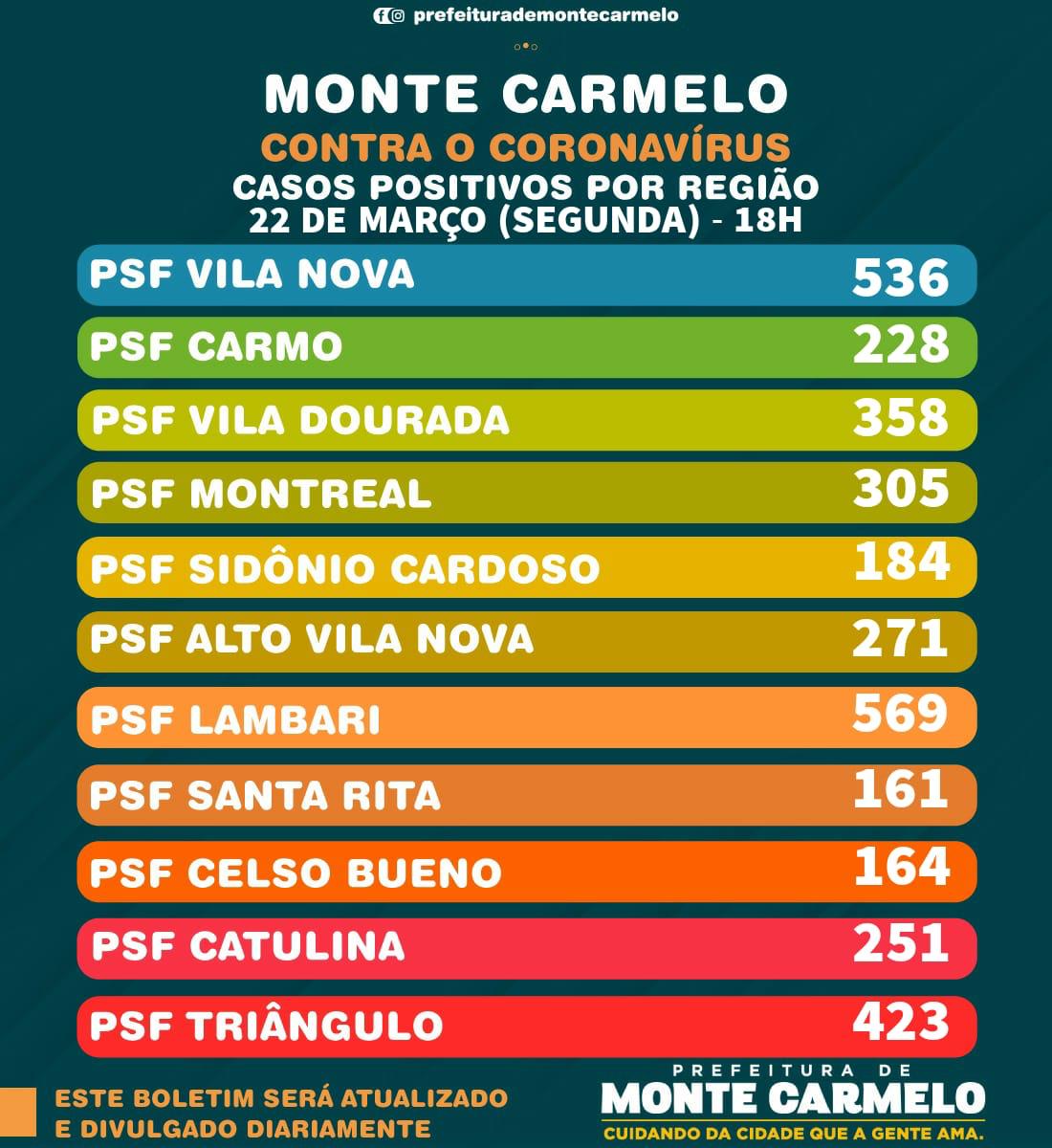 Boletim Covid-19: dois óbitos e 26 casos positivos nesta segunda feira (22) em Monte Carmelo.