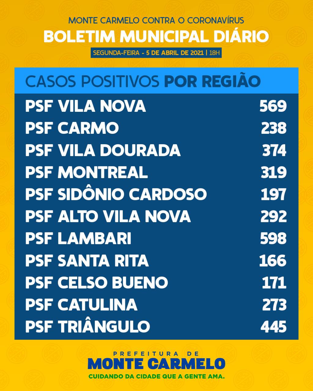 Sobre os casos registrados por região: No PSF Vila Nova são 569 registros, PSF Bairro do Carmo 238 registros, PSF Vila Dourada 374 registros, PSF Montreal 319 registros, PSF Sidônio Cardoso 197 registros, PSF Alto Vila Nova 292 registros, PSF Lambari 598 registros, PSF Santa Rita 166 registros, PSF Celso Bueno 171 registros, PSF Catulina 273 registros e PSF Triângulo 445 registros.