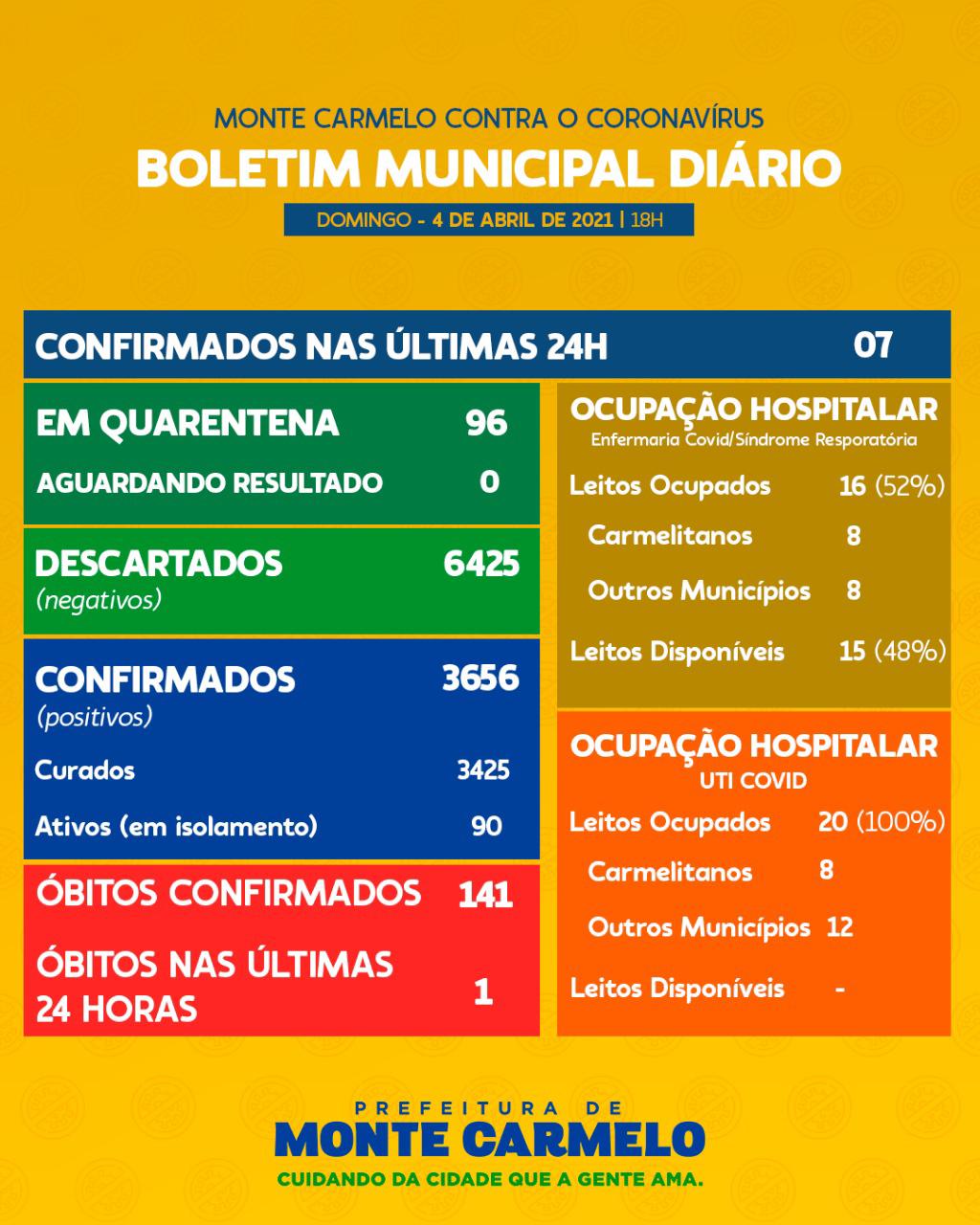 O boletim diário Covid-19 de Monte Carmelo deste domingo (4), mostra que houve um óbito nas últimas 24h e foram registrados 7 novos casos positivos. O número de casos confirmados de coronavírus soma 3.656 infectados. Desse total, 3.425 contaminados já estão curados. Os casos ativos que estão em isolamento são 90. Outras 96 pessoas estão em quarentena. Dos testes feitos 6.425 deram negativos. Foram registrados no município, 141 óbitos devido a complicações da doença.