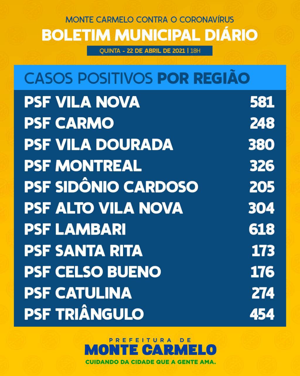 Já os casos registrados por região de Unidade de Saúde: No PSF Vila Nova 581 registros, PSF Bairro do Carmo 248 registros, PSF Vila Dourada 380 registros, PSF Montreal 326 registros, PSF Sidônio Cardoso 205 registros, PSF Alto Vila Nova 304 registros, PSF Lambari 618 registros, PSF Santa Rita 173 registros, PSF Celso Bueno 176 registros, PSF Catulina 274 registros e PSF Triângulo 454 registros.
