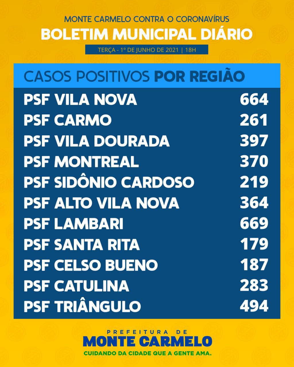 Já os casos registrados por região de Unidade de Saúde: No PSF Vila Nova 664 registros, PSF Bairro do Carmo 261 registros, PSF Vila Dourada 397 registros, PSF Montreal 370 registros, PSF Sidônio Cardoso 219 registros, PSF Alto Vila Nova 364 registros, PSF Lambari 669 registros, PSF Santa Rita 179 registros, PSF Celso Bueno 187 registros, PSF Catulina 283 registros e PSF Triângulo 494 registros.