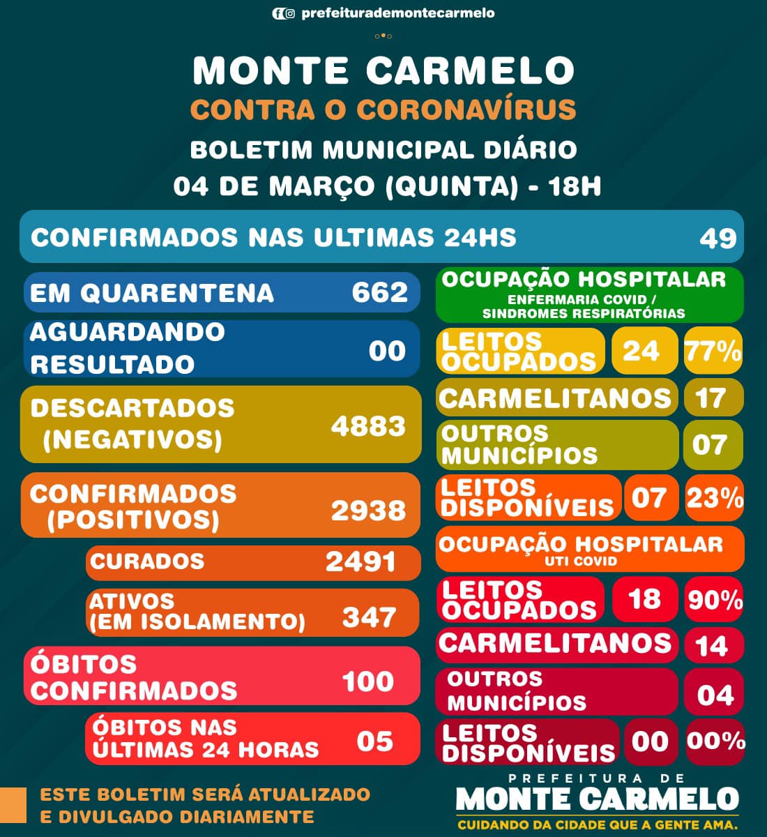 Em novo boletim divulgado pela Secretaria Municipal de Saúde nessa quinta-feira (4) foram confirmados mais 5 óbitos em Monte Carmelo nas últimas 24h e 49 novos registros de casos positivos para Covid-19. O número total de casos positivos confirmados no município é de 2938. Desses 2491 estão curados e 347 estão ativos e em isolamento. 662 pessoas estão em quarentena. Ao todo foram registrados 100 óbitos devido a complicações da doença.