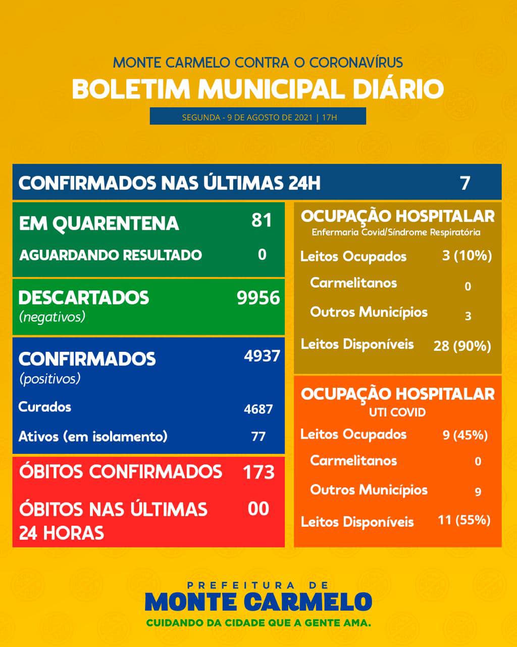 Com informações da Secretaria Municipal de Saúde o novo boletim epidemiológico sobre o coronavírus em Monte Carmelo mostra que nas últimas 24h não houve registro de óbito e sete novos casos positivos foram confirmados para Covid-19.