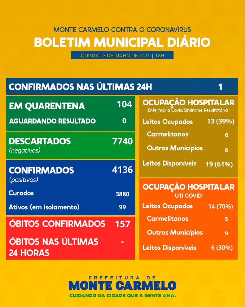 Com informações da Secretaria Municipal de Saúde o novo boletim epidemiológico sobre o coronavírus em Monte Carmelo mostra que nas últimas 24h não houve registro de óbito e um novo caso positivo foi confirmado para Covid-19.