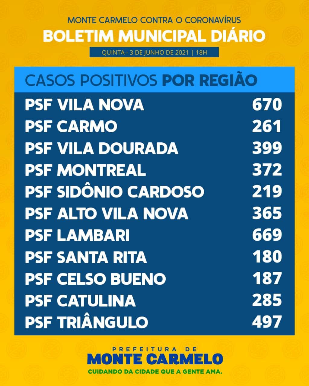 Já os casos registrados por região de Unidade de Saúde: No PSF Vila Nova 670 registros, PSF Bairro do Carmo 261 registros, PSF Vila Dourada 399 registros, PSF Montreal 372 registros, PSF Sidônio Cardoso 219 registros, PSF Alto Vila Nova 365 registros, PSF Lambari 669 registros, PSF Santa Rita 180 registros, PSF Celso Bueno 187 registros, PSF Catulina 285 registros e PSF Triângulo 497 registros.