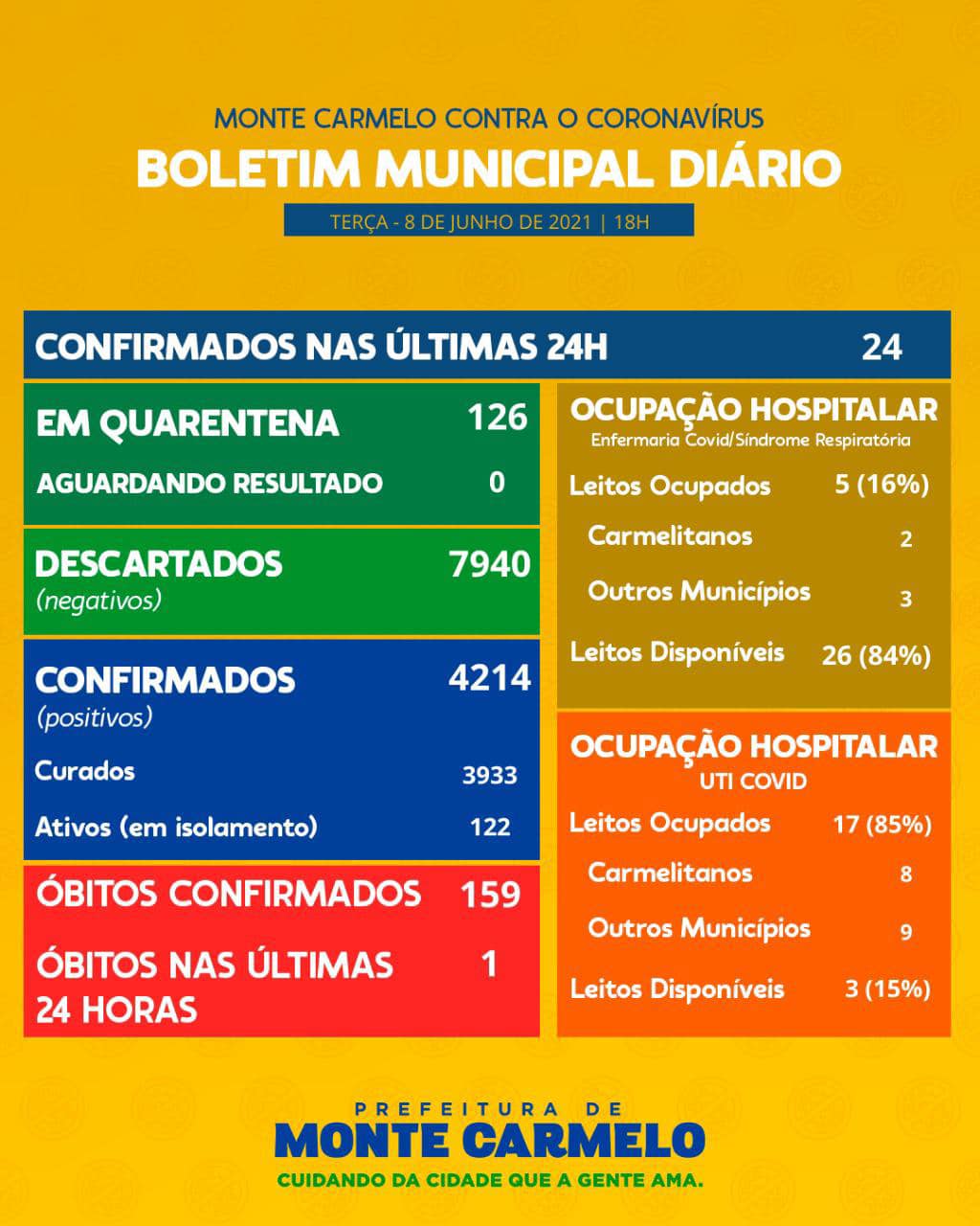 Com informações da Secretaria Municipal de Saúde o novo boletim epidemiológico sobre o coronavírus em Monte Carmelo mostra que nas últimas 24h houve o registro de mais um óbito e 24 novos casos positivos foram confirmados para Covid-19.