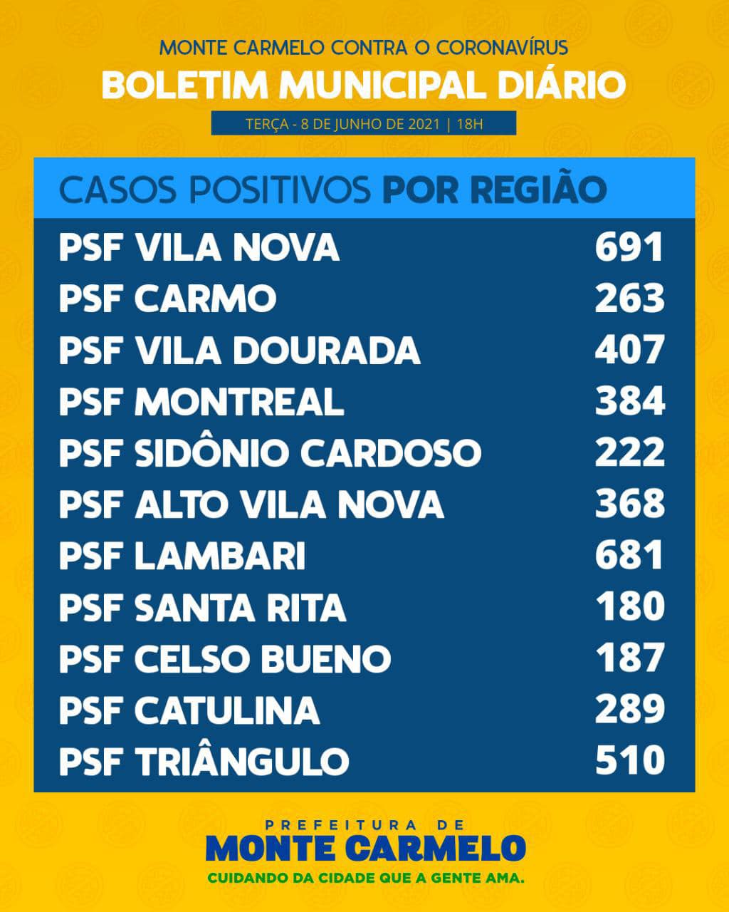 Já os casos registrados por região de Unidade de Saúde: No PSF Vila Nova 691 registros, PSF Bairro do Carmo 263 registros, PSF Vila Dourada 407 registros, PSF Montreal 384 registros, PSF Sidônio Cardoso 222 registros, PSF Alto Vila Nova 368 registros, PSF Lambari 681 registros, PSF Santa Rita 180 registros, PSF Celso Bueno 187 registros, PSF Catulina 289 registros e PSF Triângulo 510 registros.