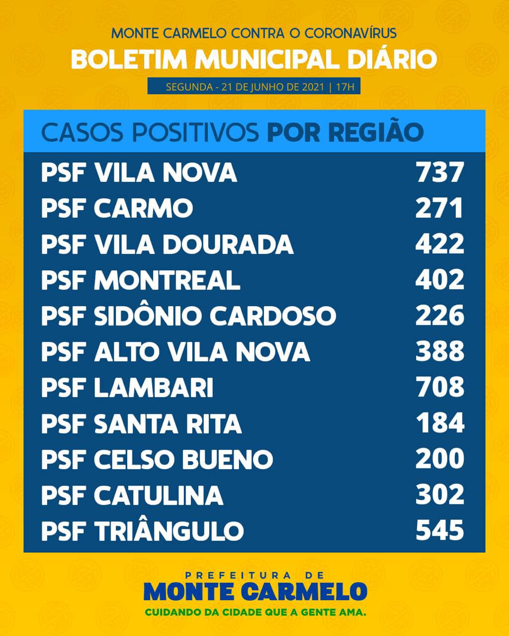 Já os casos registrados por região de Unidade de Saúde: No PSF Vila Nova 737 registros, PSF Bairro do Carmo 271 registros, PSF Vila Dourada 422 registros, PSF Montreal 402 registros, PSF Sidônio Cardoso 226 registros, PSF Alto Vila Nova 388 registros, PSF Lambari 708 registros, PSF Santa Rita 184 registros, PSF Celso Bueno 200 registros, PSF Catulina 302 registros e PSF Triângulo 545 registros.