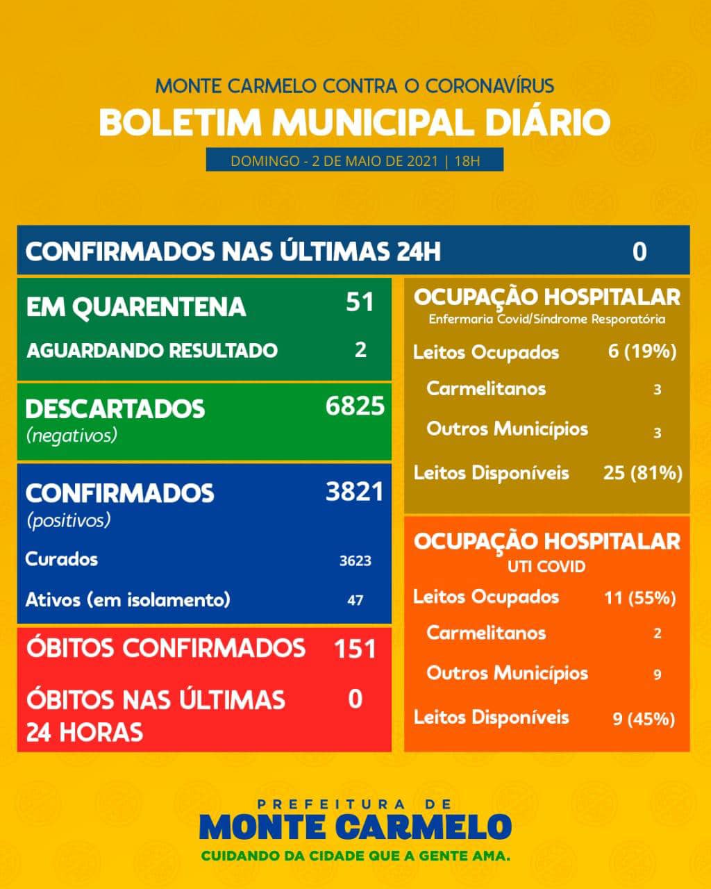 Com informações da Secretaria Municipal de Saúde o novo boletim epidemiológico sobre o coronavírus em Monte Carmelo mostra que nas últimas 24h não houve registro de óbitos e também não houve novos casos positivos para Covid-19.