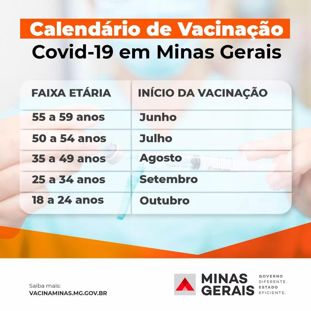 “A expectativa do Ministério da Saúde é de enviar 38 milhões de doses para todo o país em junho, 35 milhões para julho, 68 milhões para agosto, 62,5 milhões para setembro e 65 milhões para outubro. Diante disso e do histórico de que 10% das doses vem para a Minas, porque a população mineira equivale a cerca de 10% do país, temos essa expectativa por faixa etária da vacinação com a primeira dose em todo o estado”, explicou o secretário de Saúde.