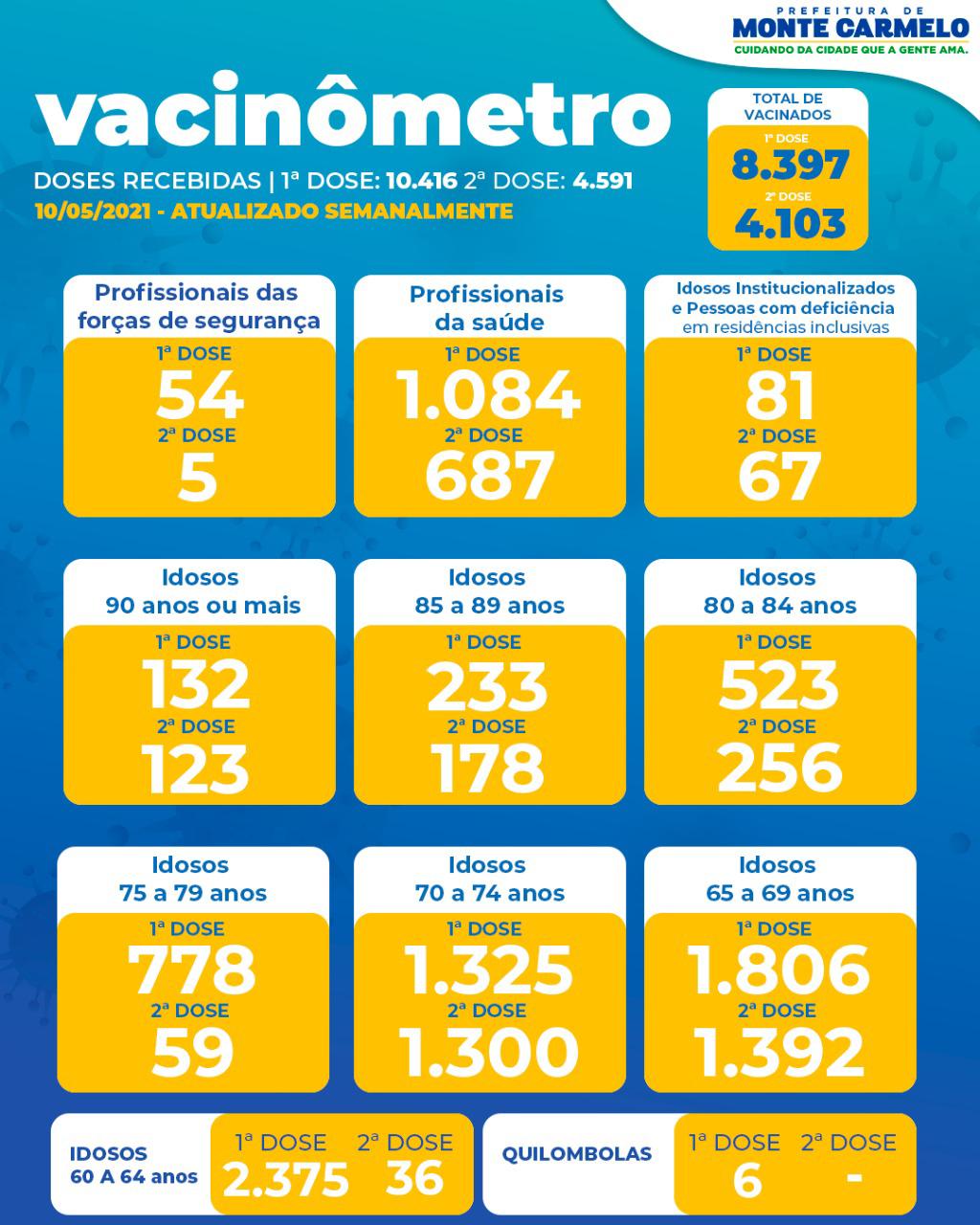 A Secretaria Municipal de Saúde divulgou nessa segunda-feira (3) as informações sobre a vacinação contra a Covid-19 em Monte Carmelo. Ao todo 12.500 doses já foram aplicadas nos grupos prioritários. Dessas 8.397 pessoas receberam a primeira dose e 4.103 pessoas receberam a segunda dose.