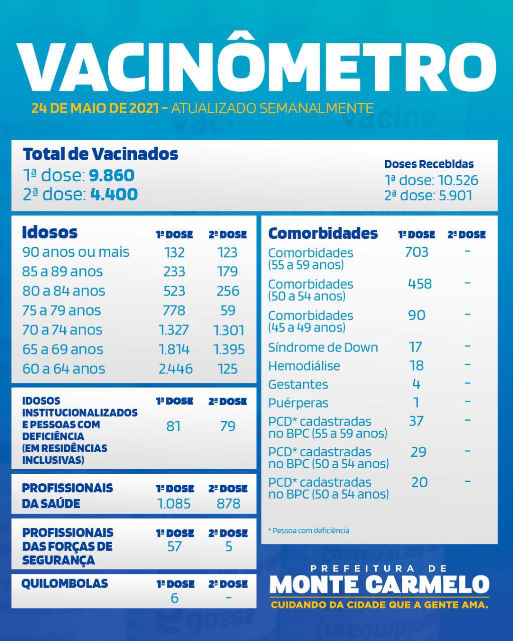 A Secretaria Municipal de Saúde divulgou nessa segunda-feira (24) as informações sobre a vacinação contra a Covid-19 em Monte Carmelo. Ao todo 14.260 doses já foram aplicadas nos grupos prioritários. Dessas 9.860 pessoas receberam a primeira dose e 4.400 pessoas receberam a segunda dose.