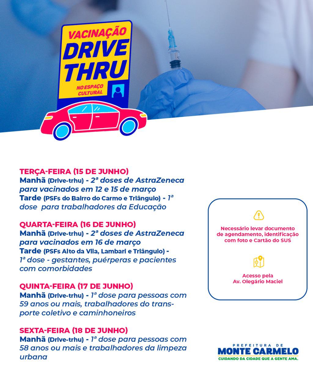 A Secretaria Municipal de Saúde de Monte Carmelo divulgou o calendário de vacinação contra a Covid-19 para essa semana. Nessa terça-feira (15) serão vacinadas na parte da manhã em formato “Drive Thru” no Espaço Cultural as pessoas que tomaram a primeira dose da AstraZeneca em 12 e 15 de março. Na parte da tarde nos PSFs do Bairro do Carmo e Triangulo terá continuidade a vacinação da 1ª dose para Trabalhadores da Educação.