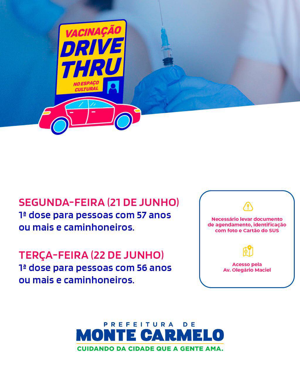Nessa segunda-feira (21) esta acontecendo à vacinação contra a Covid-19 em Monte Carmelo. Conforme a Coordenadora de Imunização Katiene Batista novos grupos por idade estão sendo agendados, como os de 57 anos ou mais, bem como a continuação das pessoas com comorbidades, caminhoneiros, entre outros.
