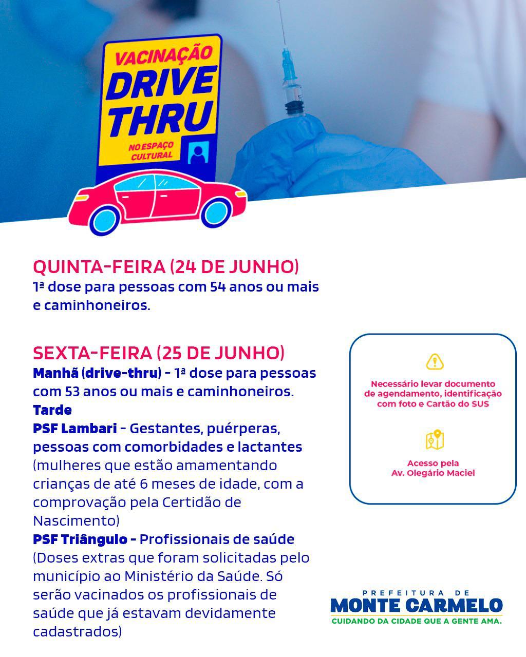 Hoje serão vacinadas com a primeira dose pessoas com 54 anos ou mais e caminhoneiros. Amanha sexta-feira (25) serão vacinadas com a primeira dose pessoas com 53 anos ou mais e caminhoneiros. No PSF do Lambari serão vacinadas Gestantes, puérperas, pessoas com comorbidades e lactantes (mulheres que estão amamentando crianças de até seis meses de idade, com a comprovação pela Certidão de nascimento). No PSF do Triangulo serão vacinados os Profissionais da Saúde com as doses extras que foram solicitadas ao Ministério da Saúde. Só serão vacinados os profissionais que já estavam devidamente cadastrados.