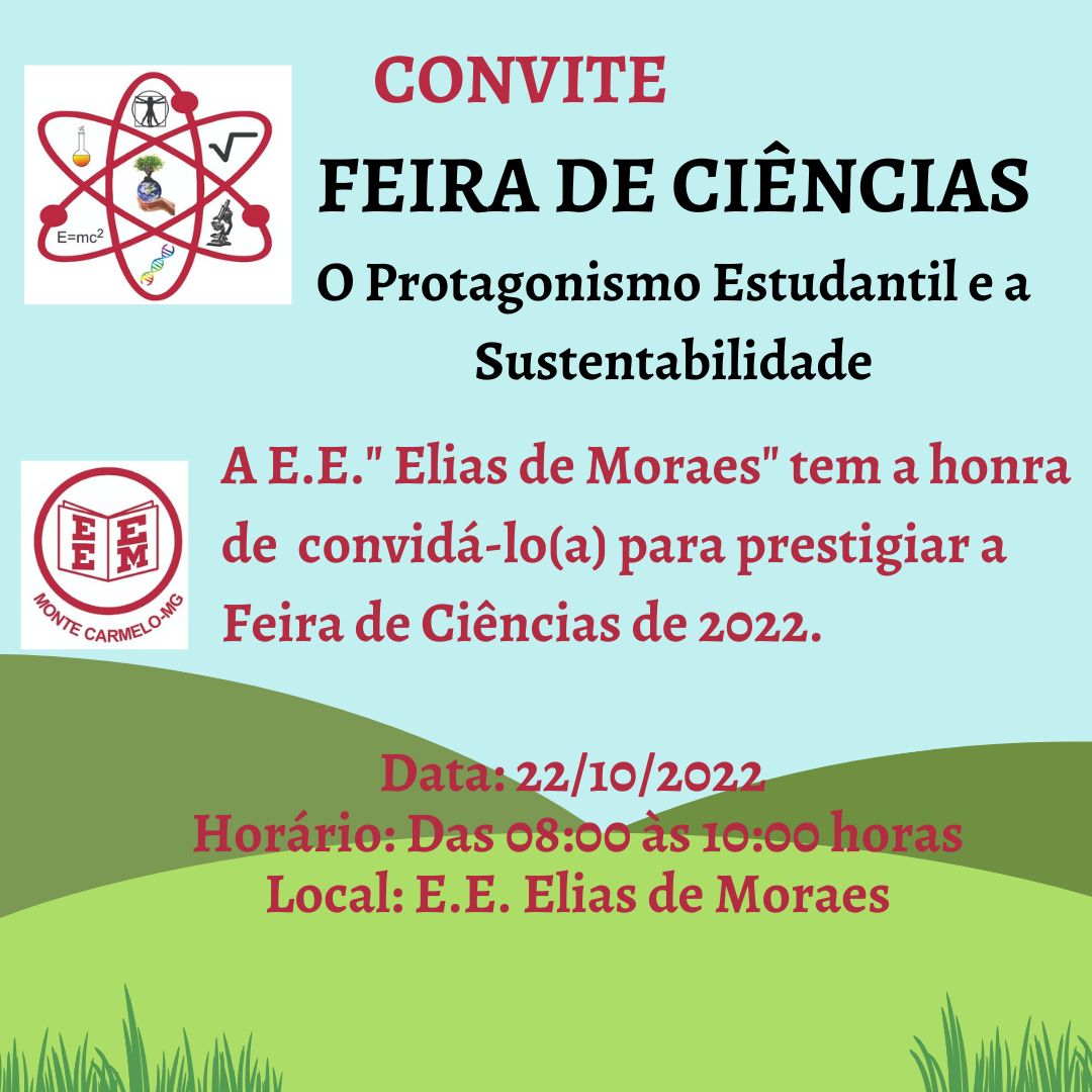 A Escola Estadual Elias de Moraes realiza no próximo dia 22 de outubro a Feira de Ciências com o tema “O protagonista estudantil e sustentabilidade”. O horário será das 08h às 10h. A direção da escola e os alunos convidam a todos a participarem.