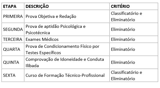 Vale destacar que o Instituto Selecon será o responsável por executar a primeira, segunda, terceira e quarta etapas e o acompanhamento da quinta etapa. A sexta etapa será objeto de regulamento específico com a supervisão da Superintendência Educacional de Segurança Pública da Sejusp.
