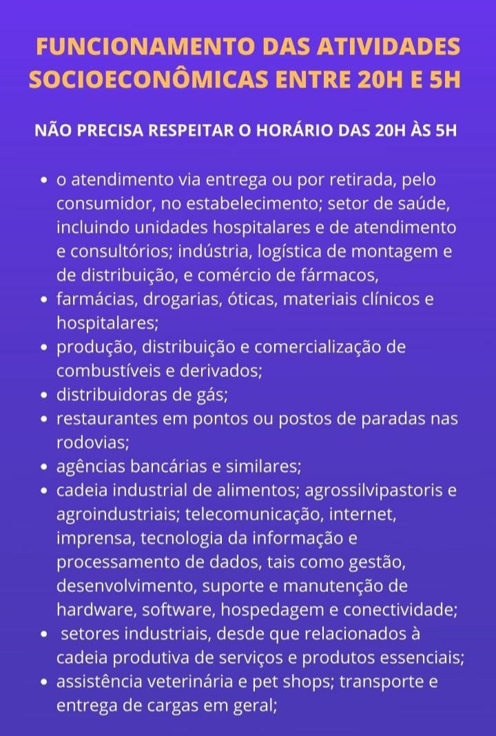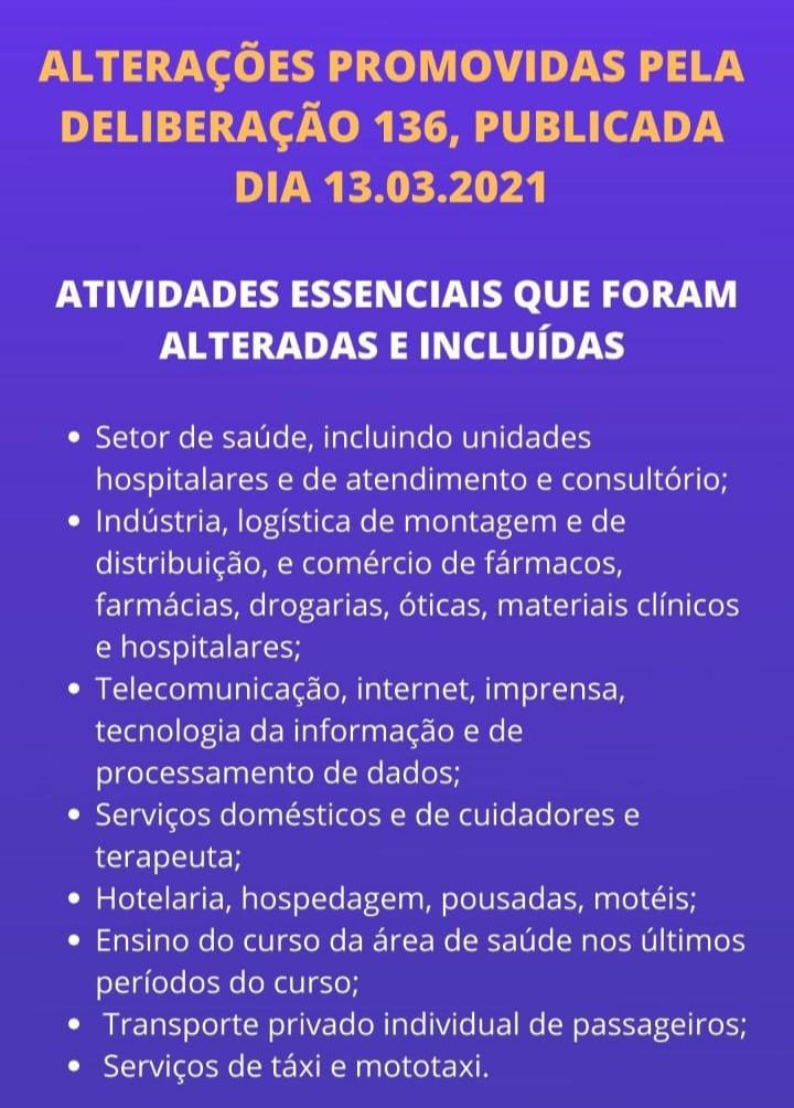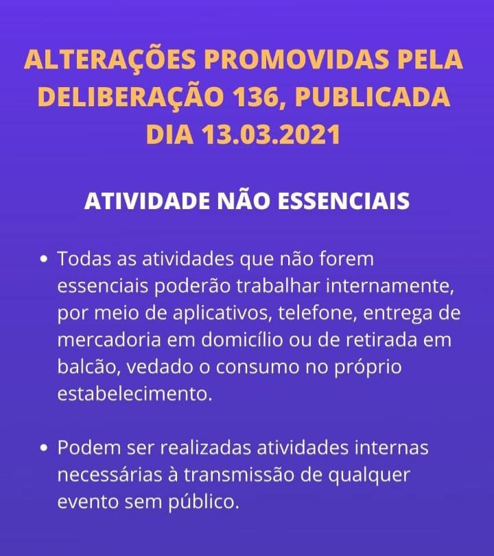 A Prefeitura de Monte Carmelo divulgou alterações promovidas pela deliberação 136, publicada no último sábado, 13 de março, pelo Governo Estadual. A deliberação atende a solicitação de prefeitos e agora os comércios com atividades não essenciais podem funcionar de forma interna com atendimento no balcão e delivery. Além disso, foi alterado e incluído várias atividades essenciais e outras atividades socioeconômicas que não precisam mais respeitar o horário do toque de recolher que vai das 20h00 às 05h00 da manhã. Com Relação à venda de bebidas alcoólicas, continua proibido após das 18h00 e também aos sábados, domingos e feriados. Os seguimentos de salão de beleza, barbearia e academia ainda estão sendo analisados pelo Governo, que deverá divulgar um posicionamento ainda no começo desta semana.
