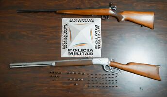 Em Irai de Minas a Polícia Militar recebeu informações sobre a existência de um mandado de prisão em aberto para um autor de 38 anos. Diante da denúncia, os militares desencadearam a Operação Batida Policial e iniciaram as diligências para capturá-lo. Deslocaram-se até residência do autor e no caminho lograram êxito em localiza-lo e este entregou voluntariamente aos militares as armas e munições que estavam em sua residência. Diante dos fatos, o autor foi preso e conduzido à Delegacia de Polícia Civil de plantão, juntamente com os materiais apreendidos. 1 Carabina Rossi, cal.38; 1 Rifle Russo, Cal.22; 44 Munições intactas cal.22; 10 Munições intactas cal.38 e 8 Cartuchos deflagrados cal.32.