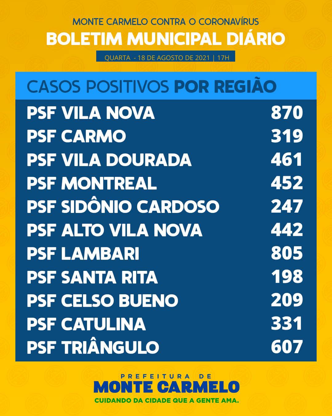 Já os casos registrados por região de Unidade de Saúde: No PSF Vila Nova são 870 registros, PSF Bairro do Carmo 319 registros, PSF Vila Dourada 461 registros, PSF Montreal 452 registros, PSF Sidônio Cardoso 247 registros, PSF Alto Vila Nova 442 registros, PSF Lambari 805 registros, PSF Santa Rita 198, PSF Celso Bueno 209 registros, PSF Catulina 331 registros e PSF Triângulo 607 registros.