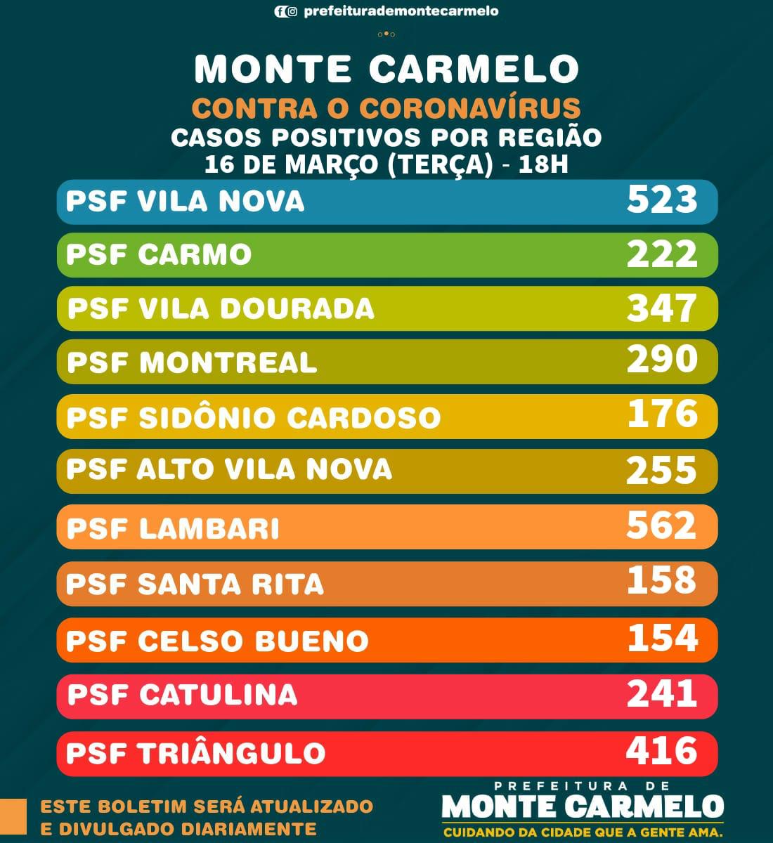 Segundo o boletim divulgado nesta terça feira (16/03) pela Secretaria Municipal de Saúde, houve um (01) óbito por covid 19 em Monte Carmelo nas últimas 24 horas. Foram confirmados mais 30 novos registros de casos positivos de coronavírus. O número total de casos positivos confirmados no município subiu para 3.375 pessoas. 3.092 já estão curadas, 164 estão ativos em isolamento e 236 pessoas estão em quarentena. Ao todo já são 119 óbitos registrados devido a complicações da doença.