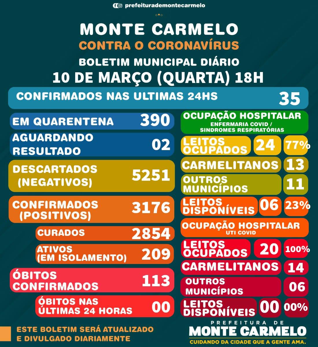 Segundo o boletim divulgado ontem (10/03) pela Secretaria Municipal de Saúde, não houve óbito por covid 19 em Monte Carmelo nas últimas 24 horas. Porém foram confirmados mais 35 novos registros de casos positivos de coronavírus. O número total de casos positivos confirmados no município subiu para 3.176 pessoas. 2.854 já estão curadas, 209 estão ativos em isolamento e 390 pessoas estão em quarentena. Ao todo são 113 óbitos registrados devido a complicações da doença.