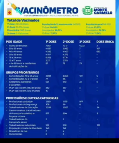 15 dezSecretaria de saúde divulga dados do vacinômetro contra a Covid-19 em Monte Carmelo.