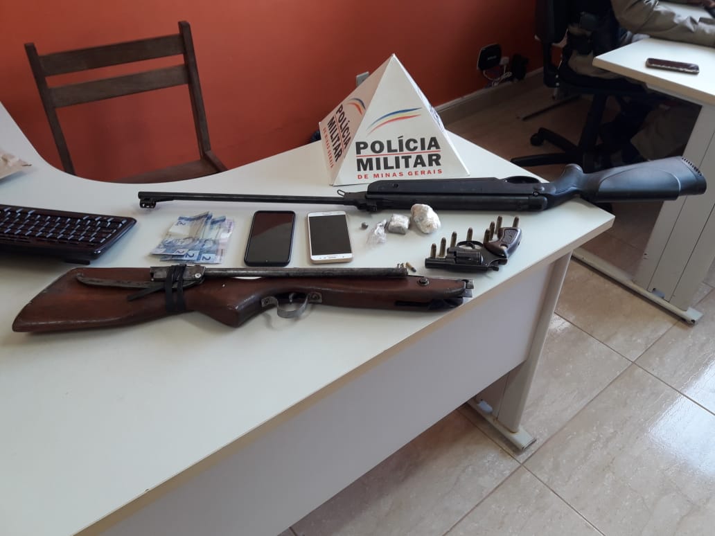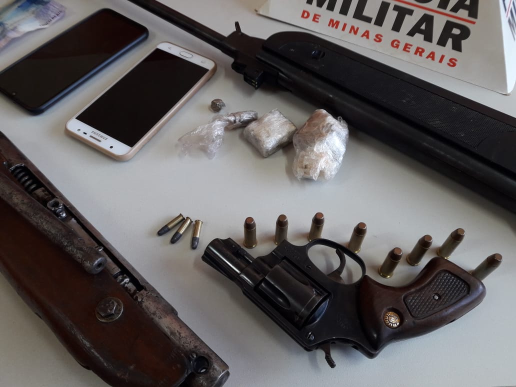 Durante fase repressiva da Operação foi cumprindo mandado de busca e apreensão no Distrito do Mateiro, Zona Rural de Coromandel. Foi realizada a abordagem de uma segunda residência em decorrência de flagrante na primeira. Durante as buscas foram localizados 01 espingarda cal.22; 01 arma de pressão adaptada para cal.22; 01 revólver cal.38; 04 munições intactas cal.22; 08 munições intactas cal.38; 03 tabletes de maconha; 02 buchas de maconha e 02 aparelhos celulares. Os dois autores, 47 e 23 anos, foram presos e conduzidos à Delegacia de Polícia Civil de plantão, juntamente com os materiais apreendidos.