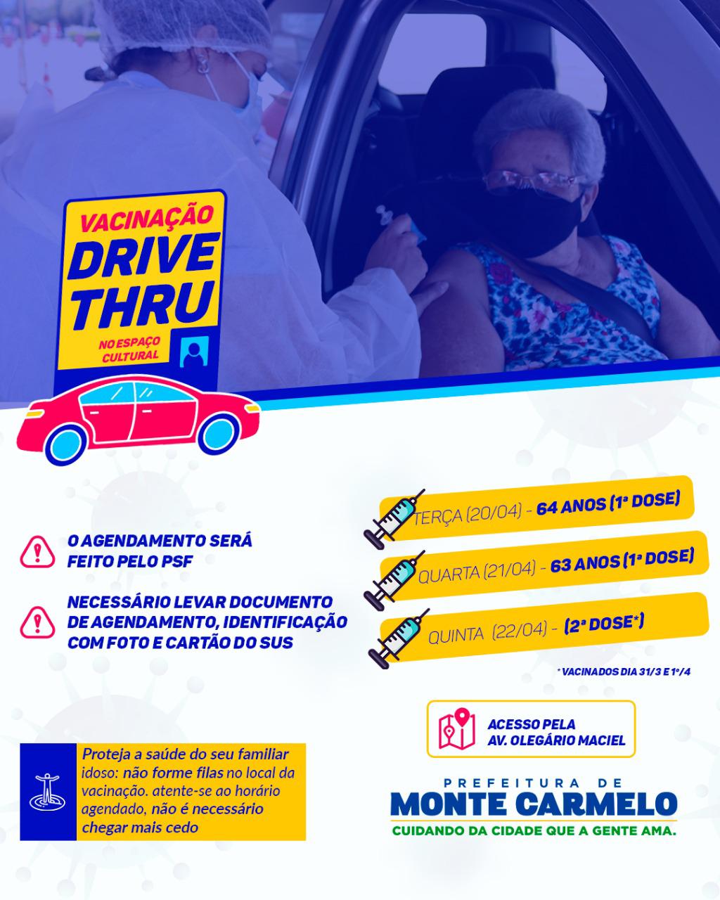 Nessa terça-feira (20) serão vacinadas pessoas de 64 anos (primeira dose). Na quarta-feira (21) serão vacinadas pessoas com 63 anos (primeira dose) e na quinta-feira (22) será aplicada (segunda dose) para os que vacinaram a primeira dose em 31 de março e primeiro de abril.