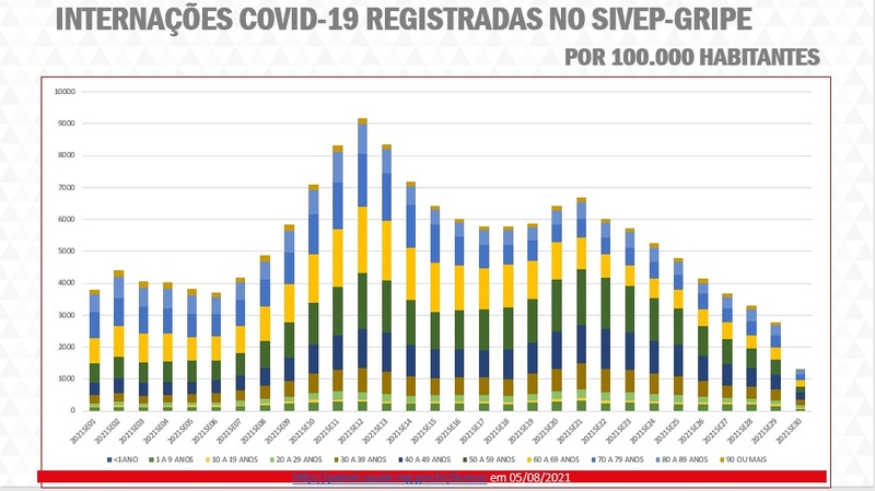 Baccheretti apresentou o gráfico das internações por covid-19 em Minas, com as proporções para faixas etárias, de 3/1 a 31/7/2021.
