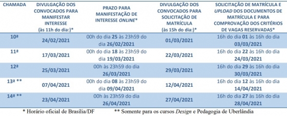 Os candidatos convocados têm até as 23h59 desta sexta-feira, dia 26, para acessar a PÁGINA DO SISU 2020/1 e preencher o formulário de manifestação de interesse on-line. Já o período de matrículas será das 16 horas do dia 1º às 16 horas de 3 de março.